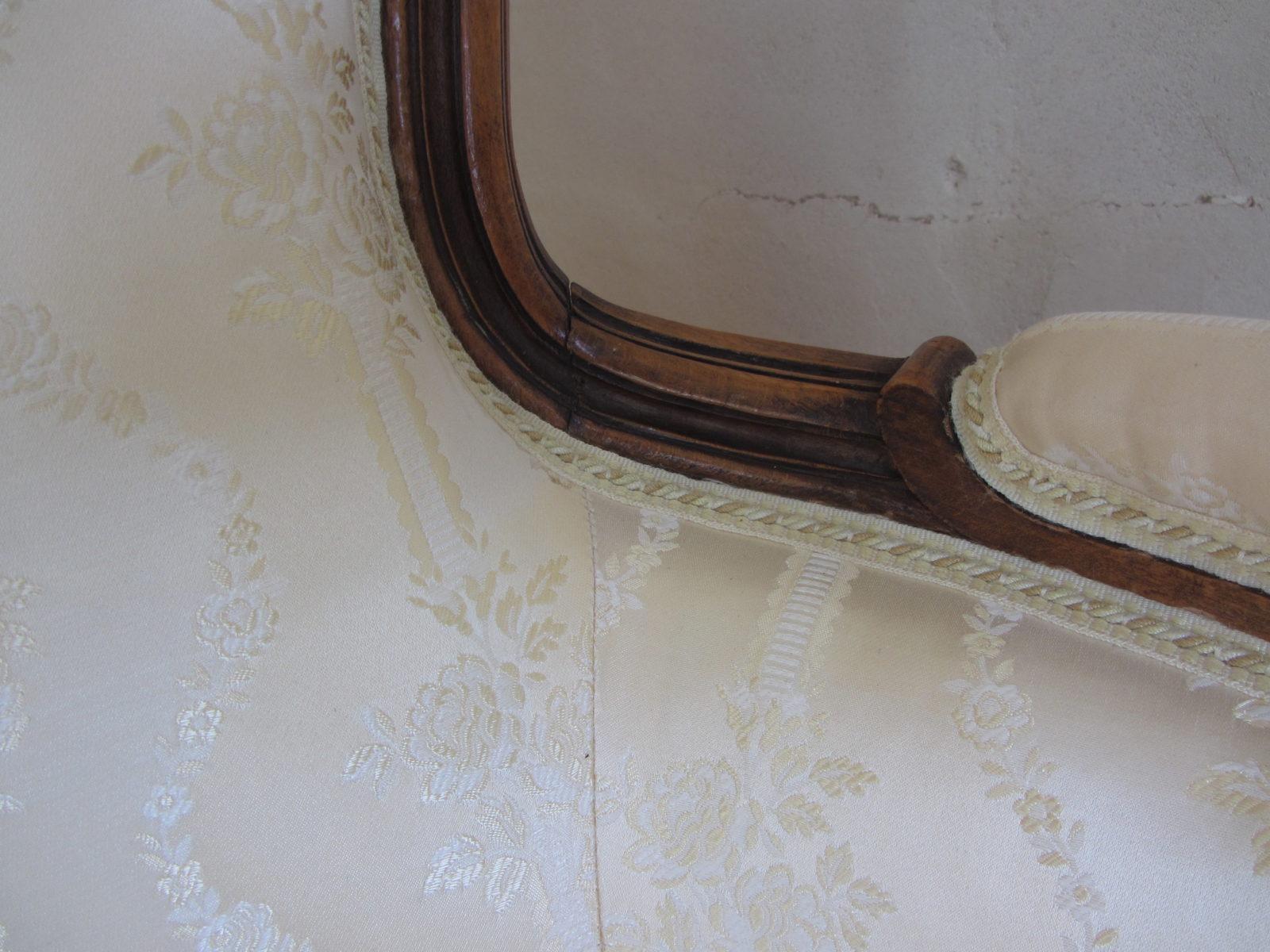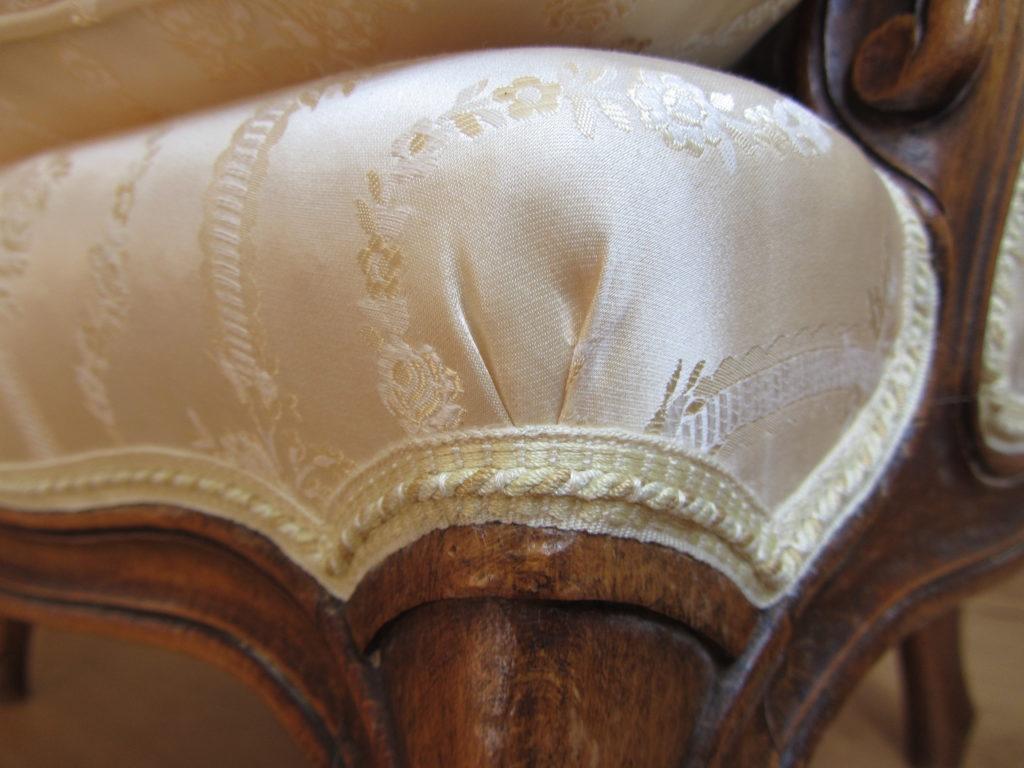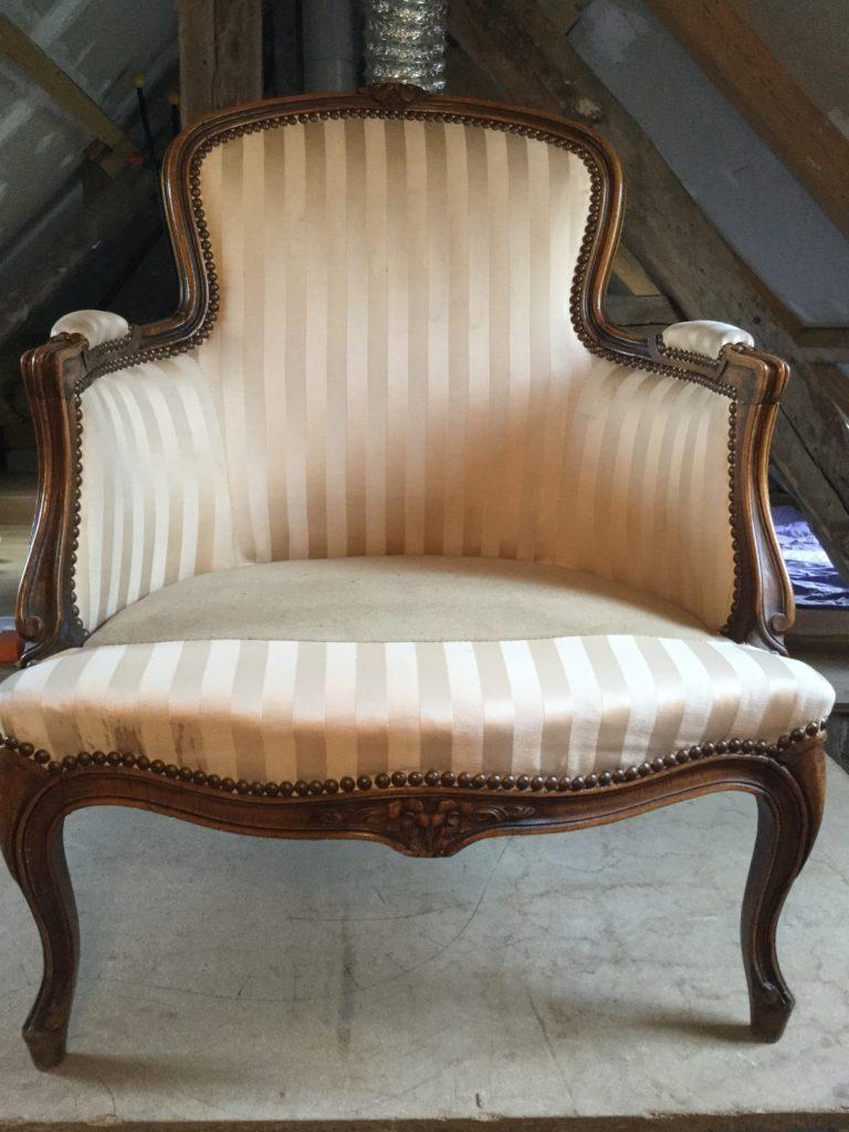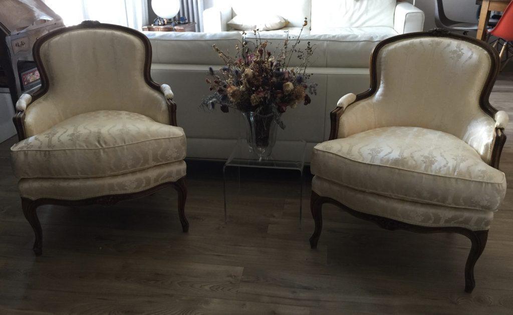 Réfection complète et traditionnelle de deux bergères de style Louis XV. Les clients ont choisi un joli tissu de la Maison Charles Burger, le Damas Petit Trianon de couleur crème. Un tissu très classique, soyeux qui représente bien le type de motifs utilisés à l’époque de Louis XV. Les coussins ont été garnis de plumes et duvet pour un superbe effet gonflant. De retour à Paris.
