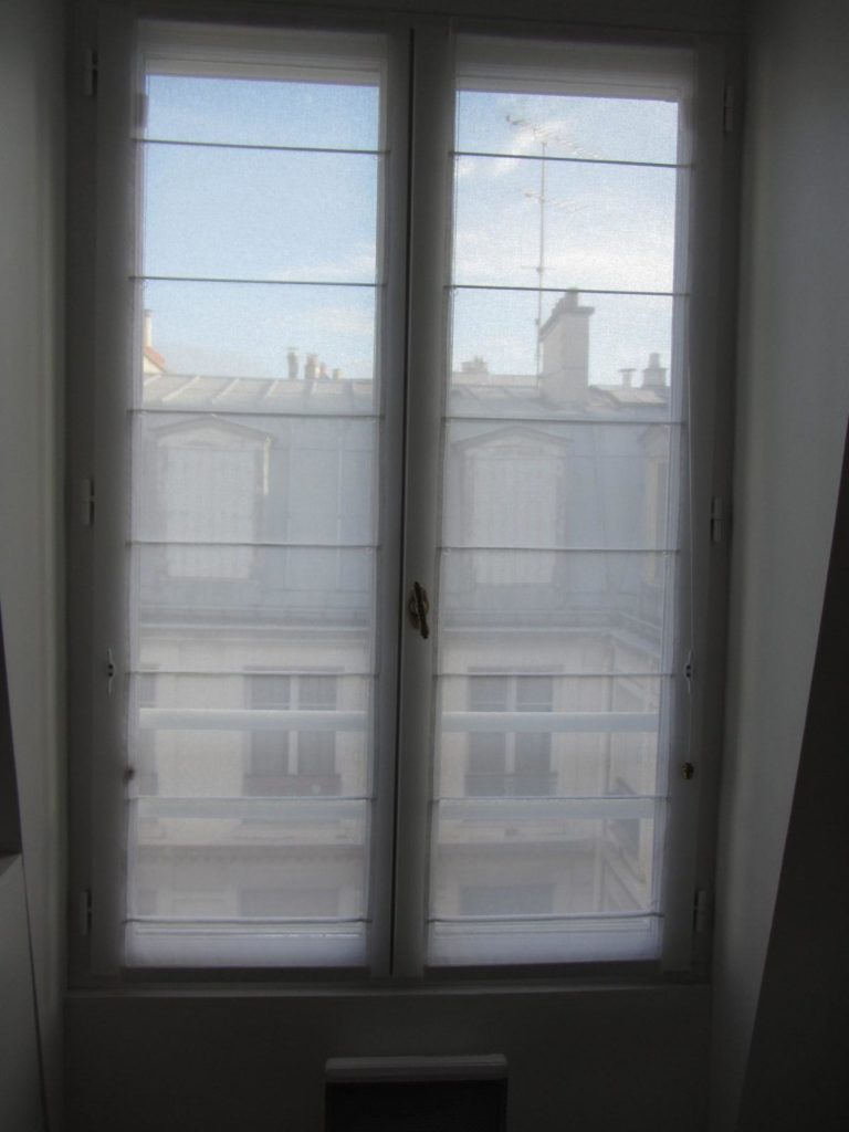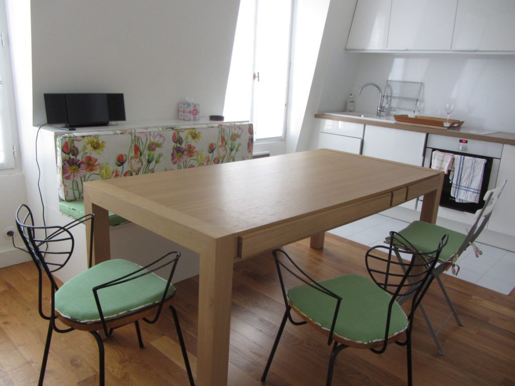Au mois d’août, nous avons installés des coussins de banquette et des stores bateau dans un appartement parisien typique.