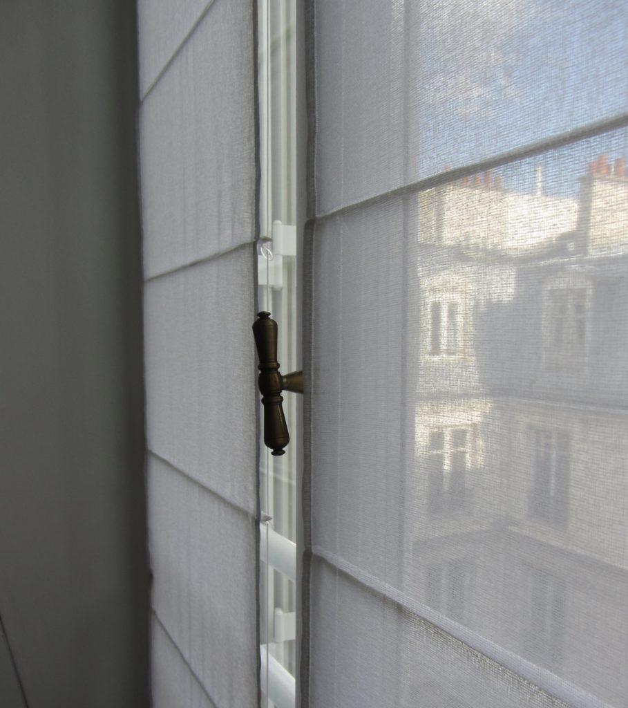 Les stores bateau on été réalisés dans un voile très léger de chez Houlès. L’ensemble donne un air printanier et cosy à la pièce principale de cet appartement.