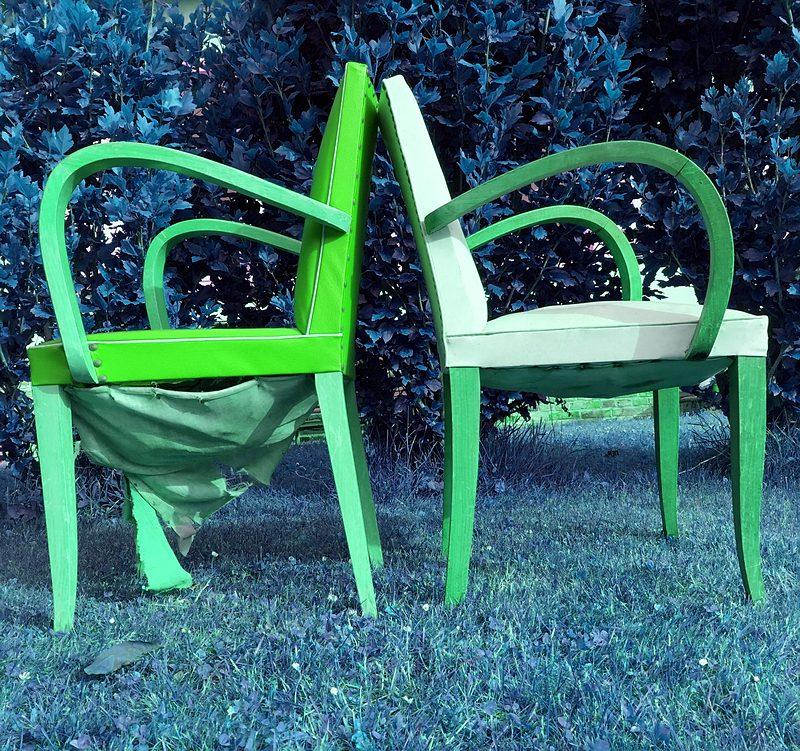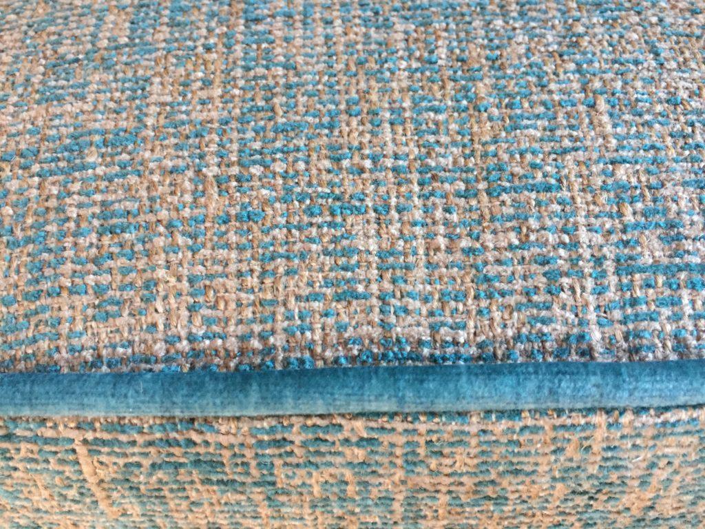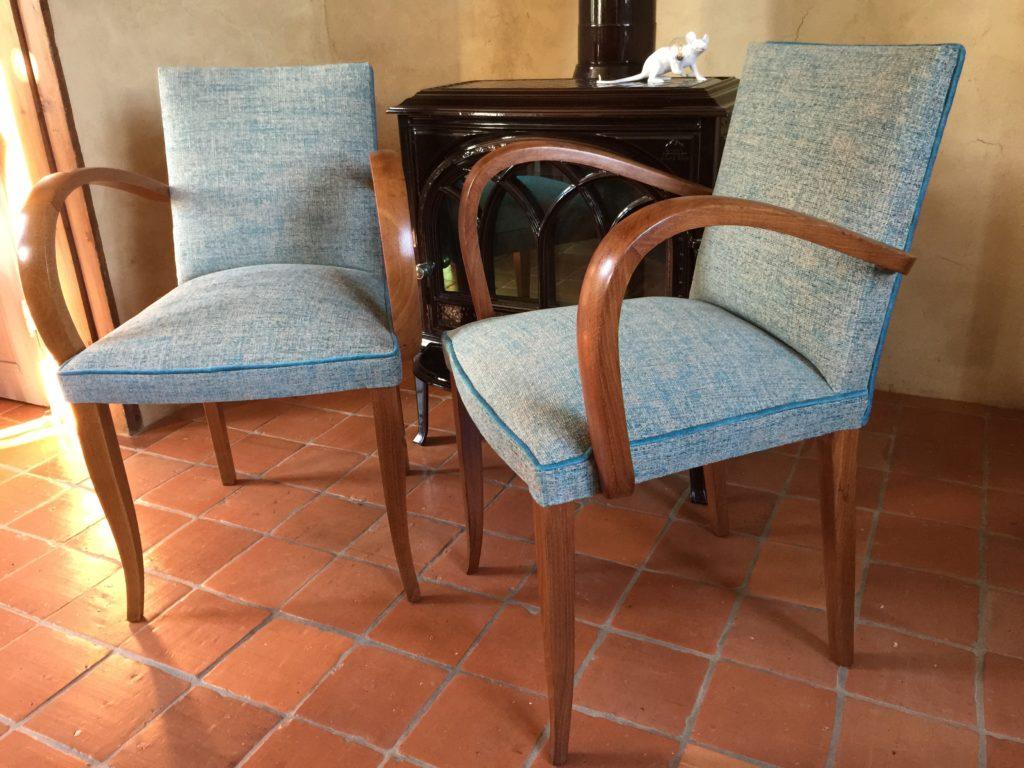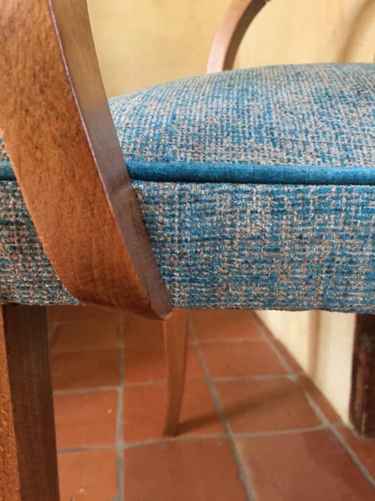 Restauration traditionnelle de deux fauteuils Bridge années 50. Les accotoirs et les pieds ont été poncés, teintés et vernis. Le tissu a été choisi dans la collection Luciano Marcato et le passepoil est en velours bleu canard de chez Casal.